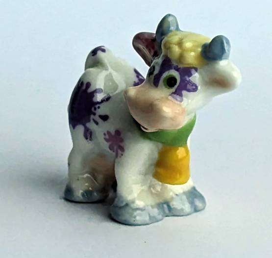 Die kleine, handbemalte Keramikfigur einer Kuh ist ein besonderes Kunstwerk, das sowohl durch seine künstlerische Liebe zum Detail als auch durch seine charmante Verwirrtheit besticht. Mit einer Größe von nur 2 cm ist sie das perfekte Accessoire für jeden Wohnraum oder Schreibtisch.