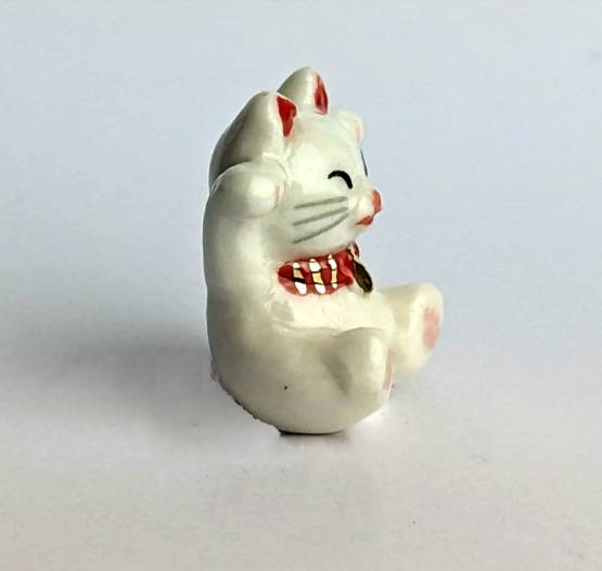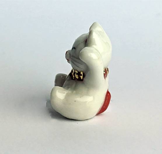 Weiß, Rot, Gold und Schwarz. Diese liebevoll gestaltete Keramikfigur einer sitzenden weißen Katze ist ein echtes Highlight für jeden Katzenliebhaber. Die Figur zeigt die Katze dabei, wie sie beide Pfoten in die Luft streckt und mit einem rot-goldenen Halsband geschmückt ist.