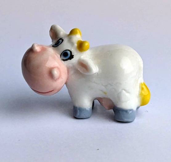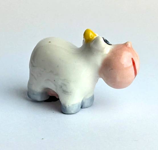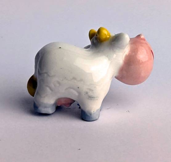 Die künstlerisch liebevoll handbemalte Keramikfigur einer glücklichen Kuh mit einer großen Nilpferdschnauze ist ein ungewöhnliches und einzigartiges Kunstwerk für jeden Kuh-Liebhaber. Mit einer Größe von nur 2 cm passt diese Figur perfekt in jedes Regal oder jede Vitrine und ist somit auch eine tolle Ergänzung für jede Sammlung.